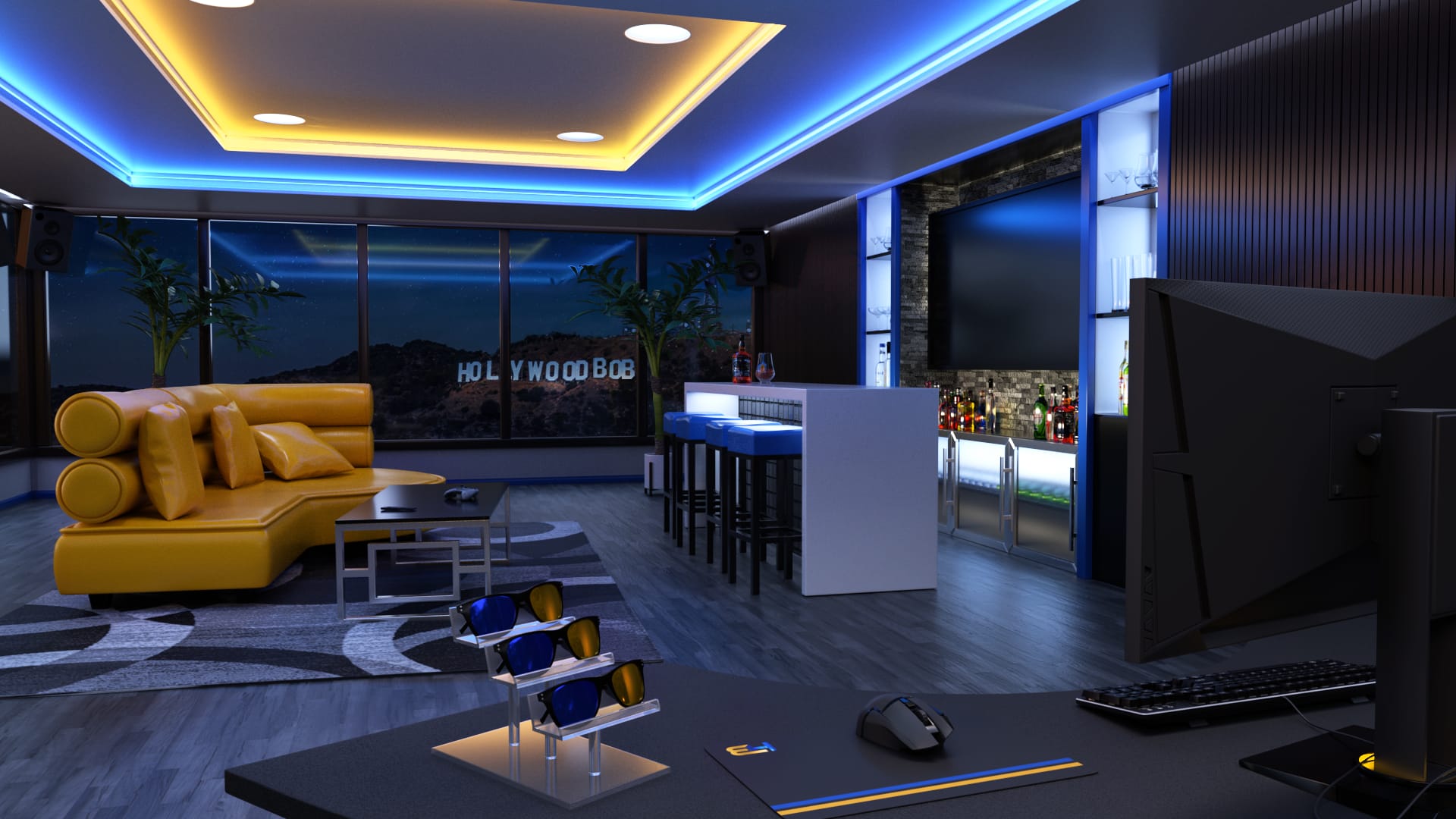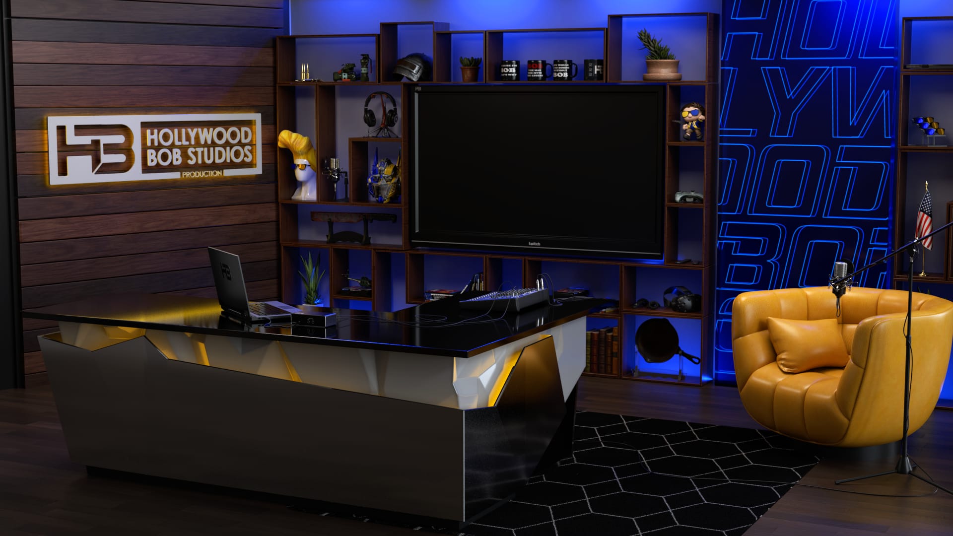 This is freelance work I do for the Twitch Streamer, Hollywood Bob. I design and create 3D scenes that consistently stick to the streamer’s brand and color scheme. These renders are used as overlays so that the streamer can place himself in front of a green screen and appear to be in these environments. I work on each scene for about two weeks and submit all deliverables completed, polished, and in a timely fashion. In addition to rendering stills, I often add micro animations, such as lights changing colors or dust particles in the air.